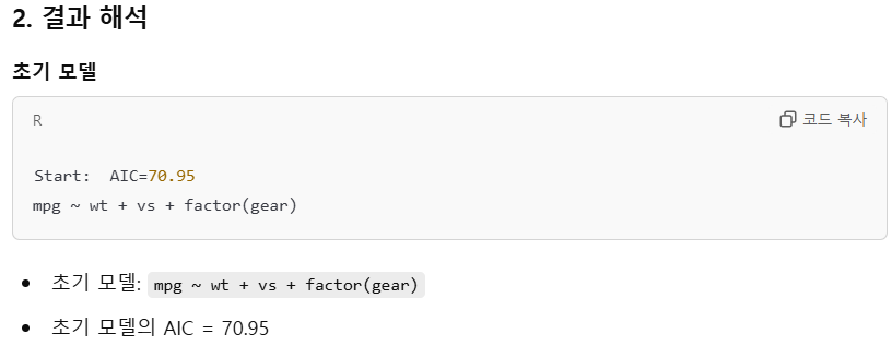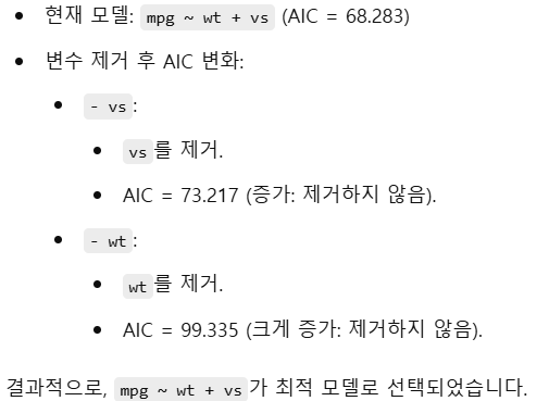 - 목적: 주어진 초기 모델(res)에서 AIC를 기준으로 독립 변수를 추가하거나 제거하여 가장 간단하고 적합한 모델을 찾습니다.