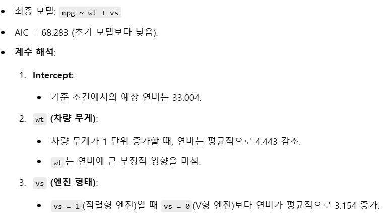 주요 변수 : wt(차량 무게)는 연비에 강한 부정적 영향을 미치는 주요 변수로, 매우 유의미한 결과를 보여줍니다.