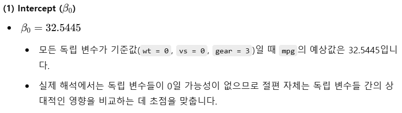 이때 categorical 데이터인 gear는 3, 4, 5로 구분되며, 기본 기준 수준(reference level)은 gear = 3입니다.