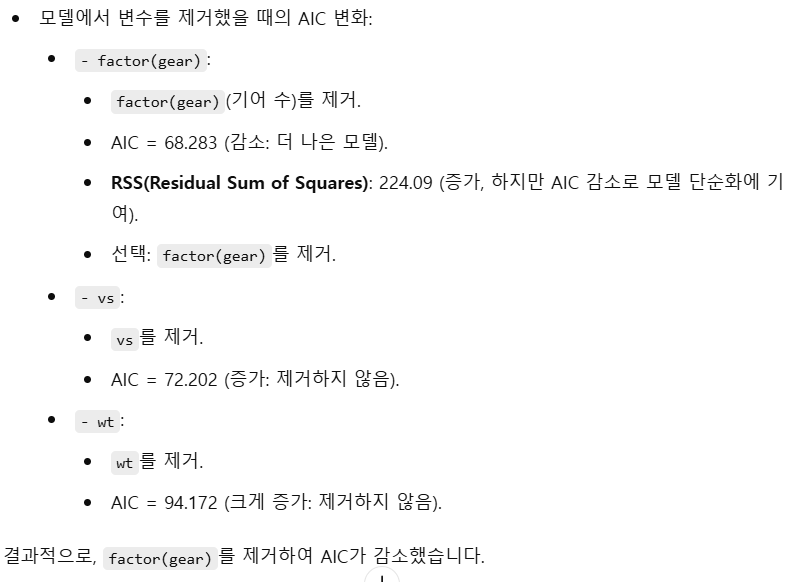 유의미하지 않은 변수 : vs(엔진 형태) 및 factor(gear)(기어 수)는 통계적으로 유의미하지 않으며, 연비에 큰 영향을 미친다고 보기 어렵습니다.